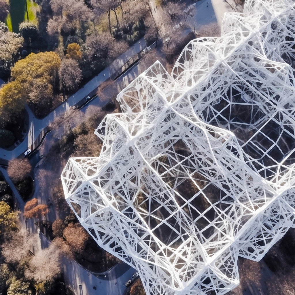 Architectonic 3D-printed megastructures grace urban parks - a contemporary echo of radical design. Each structure a nod to Superstudio's avant-garde spirit, redefining urban landscapes with a harmonious fusion of innovation and environmental rigor and boldness.