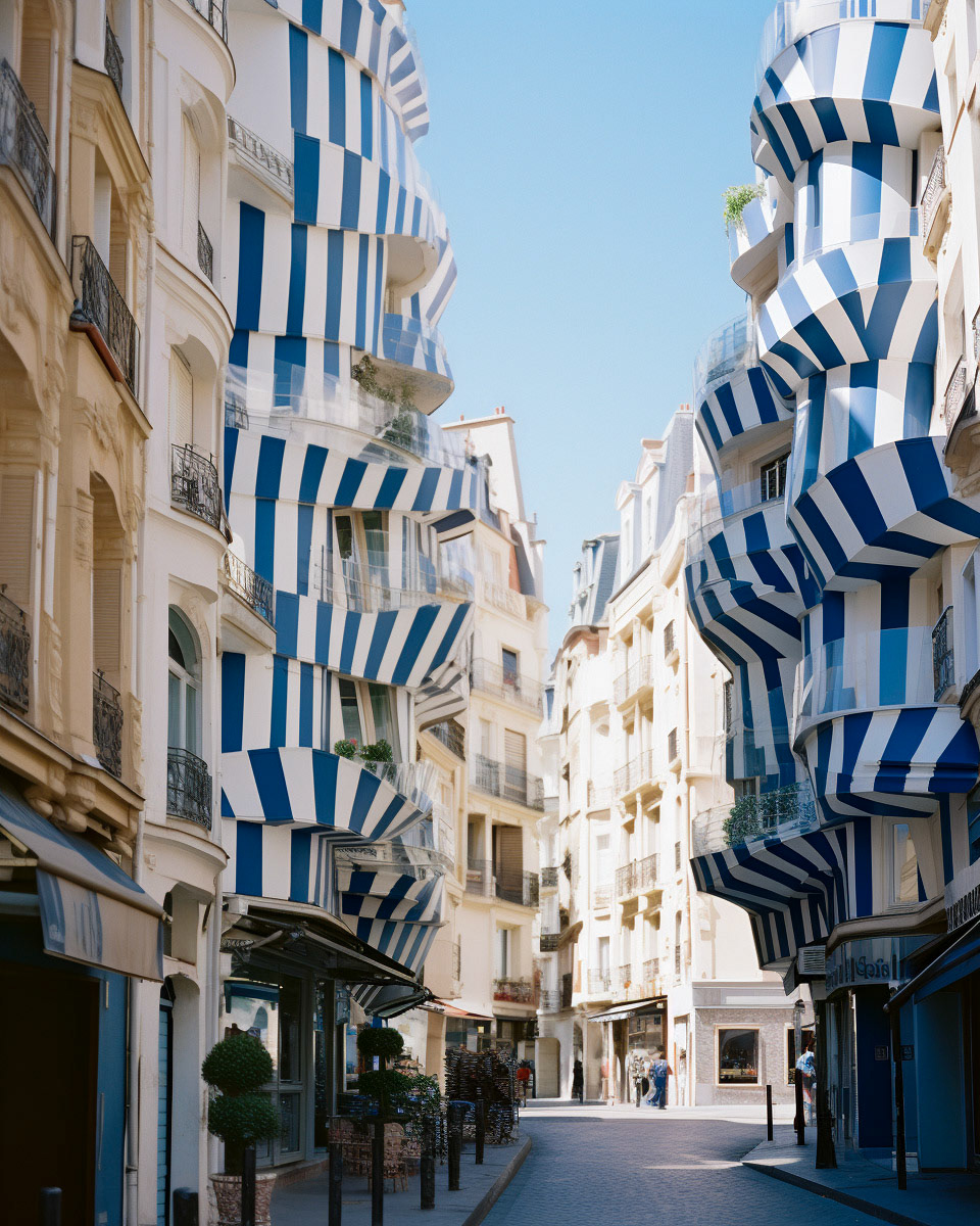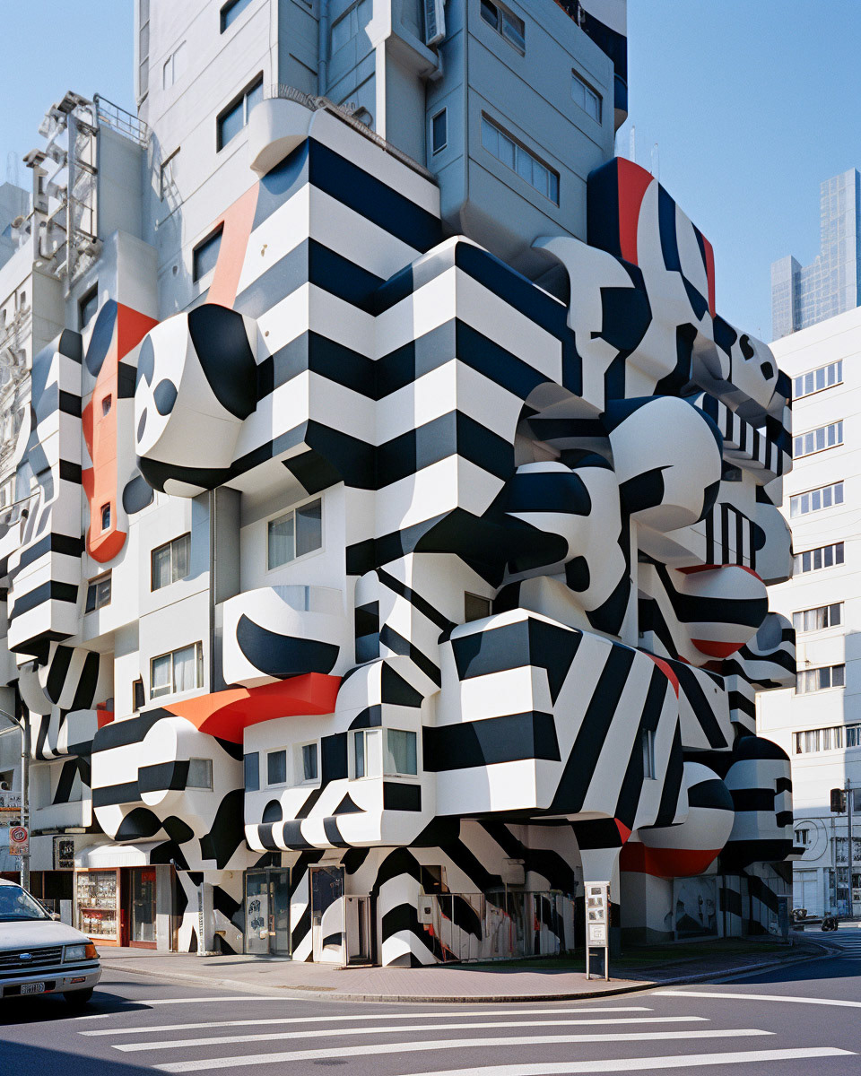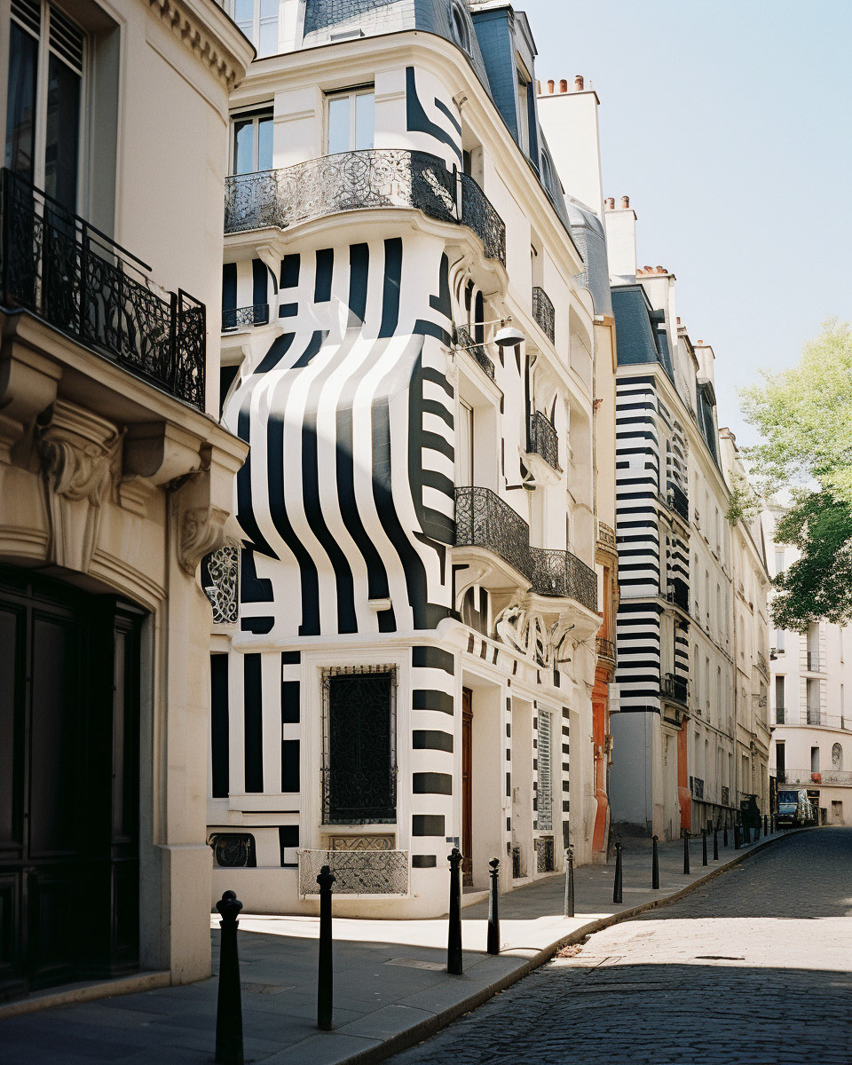 Urban metamorphosis: Camouflage architecture in New York, Tokyo, and Paris adopts black and white stripe design. A visual illusion blurring the very shape of cityscapes, where contemporary design seamlessly integrates with the urban rhythm in a monochromatic dance.