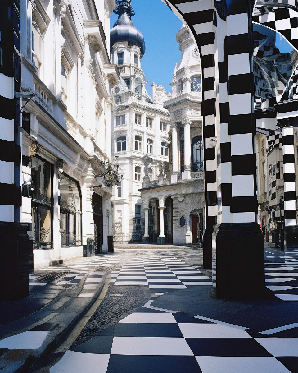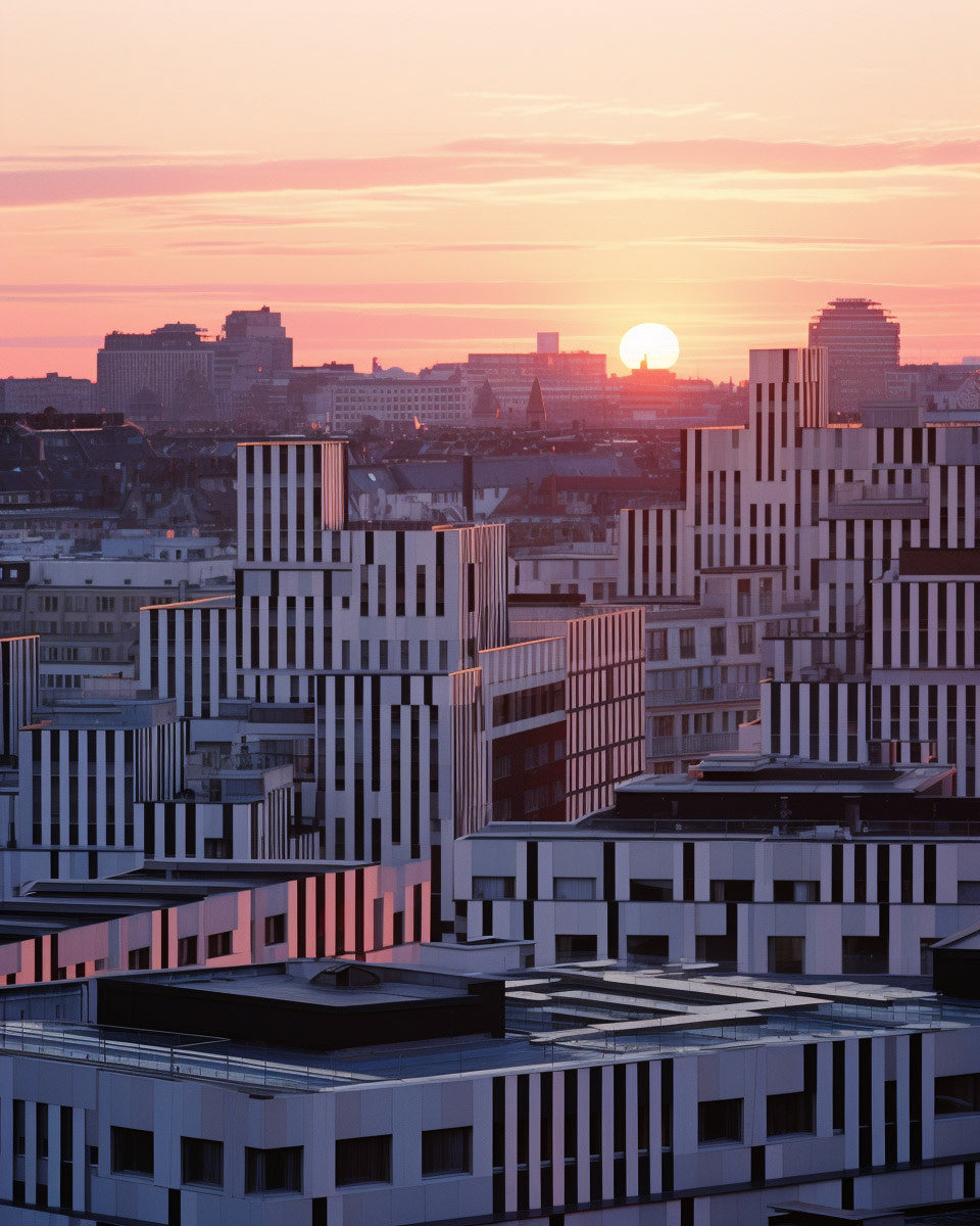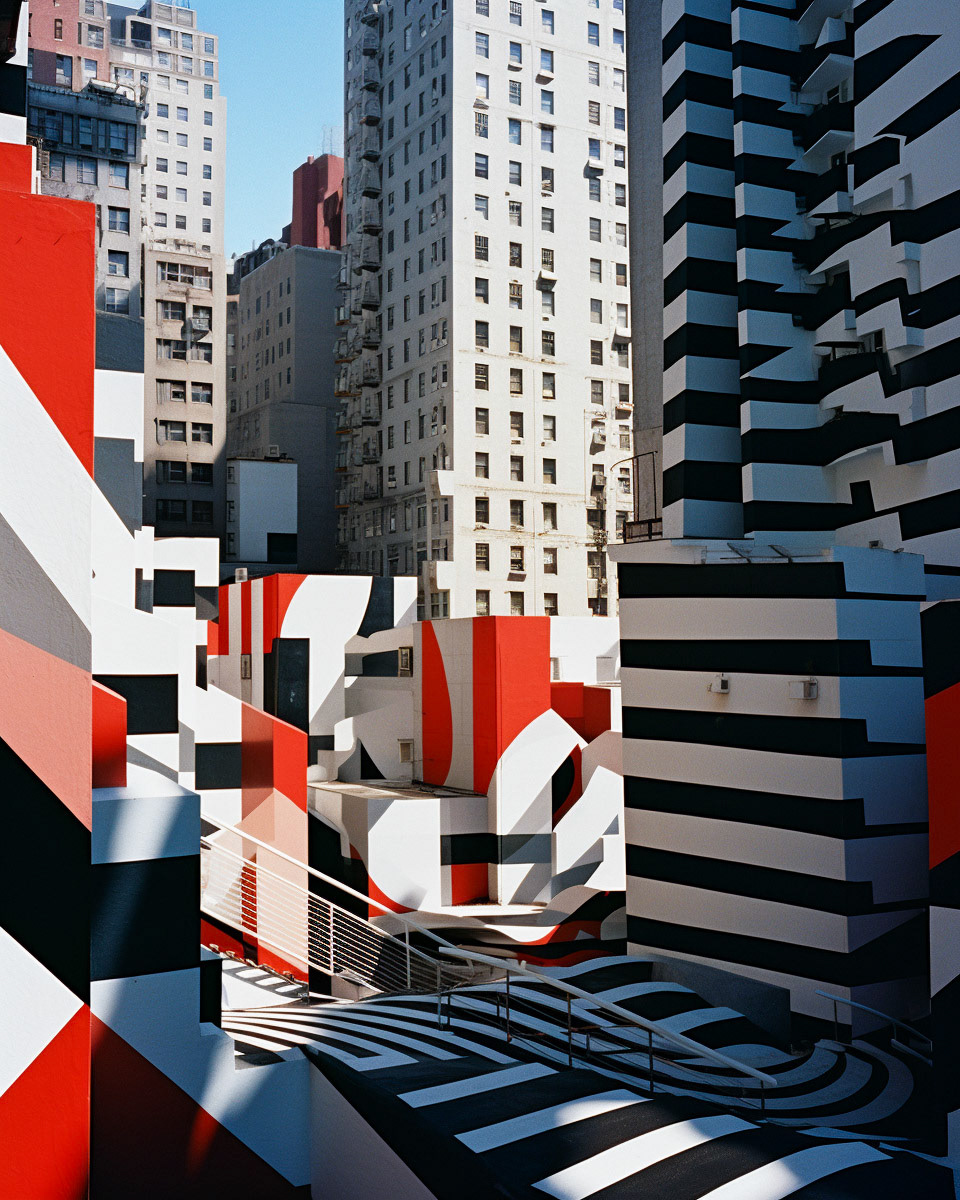 Urban metamorphosis: Camouflage architecture in New York, Tokyo, and Paris adopts black and white stripe design. A visual illusion blurring the very shape of cityscapes, where contemporary design seamlessly integrates with the urban rhythm in a monochromatic dance.