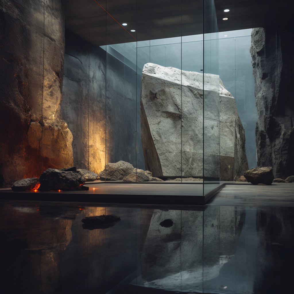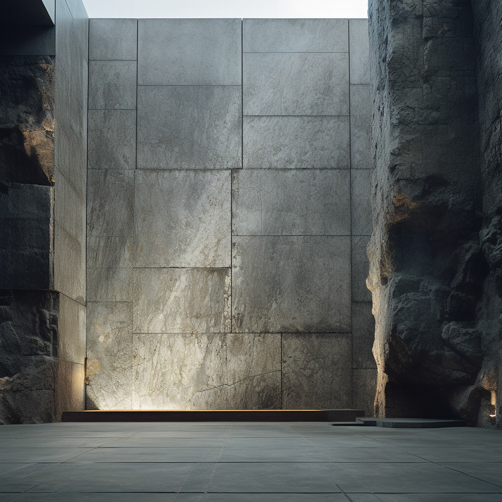 Contrasting realms: Modern architecture's polished concrete meets the rugged embrace of raw, rough rocks. In this visual dialogue, the interplay of sleek lines and untamed textures redefine the harmony between contemporary design and nature's raw beauty.