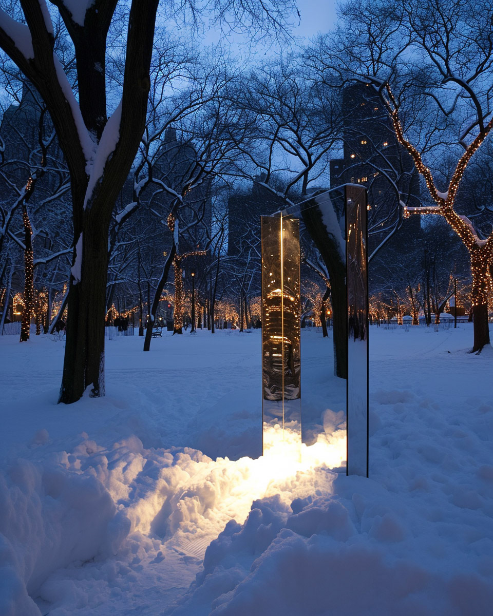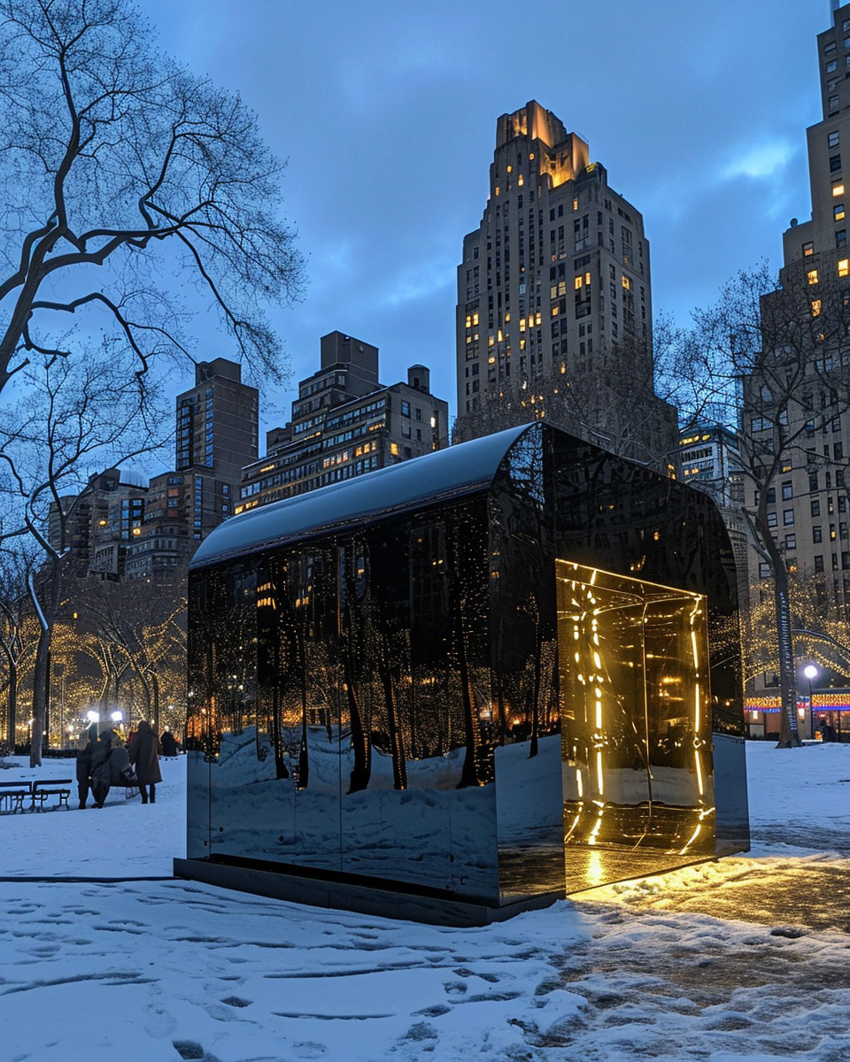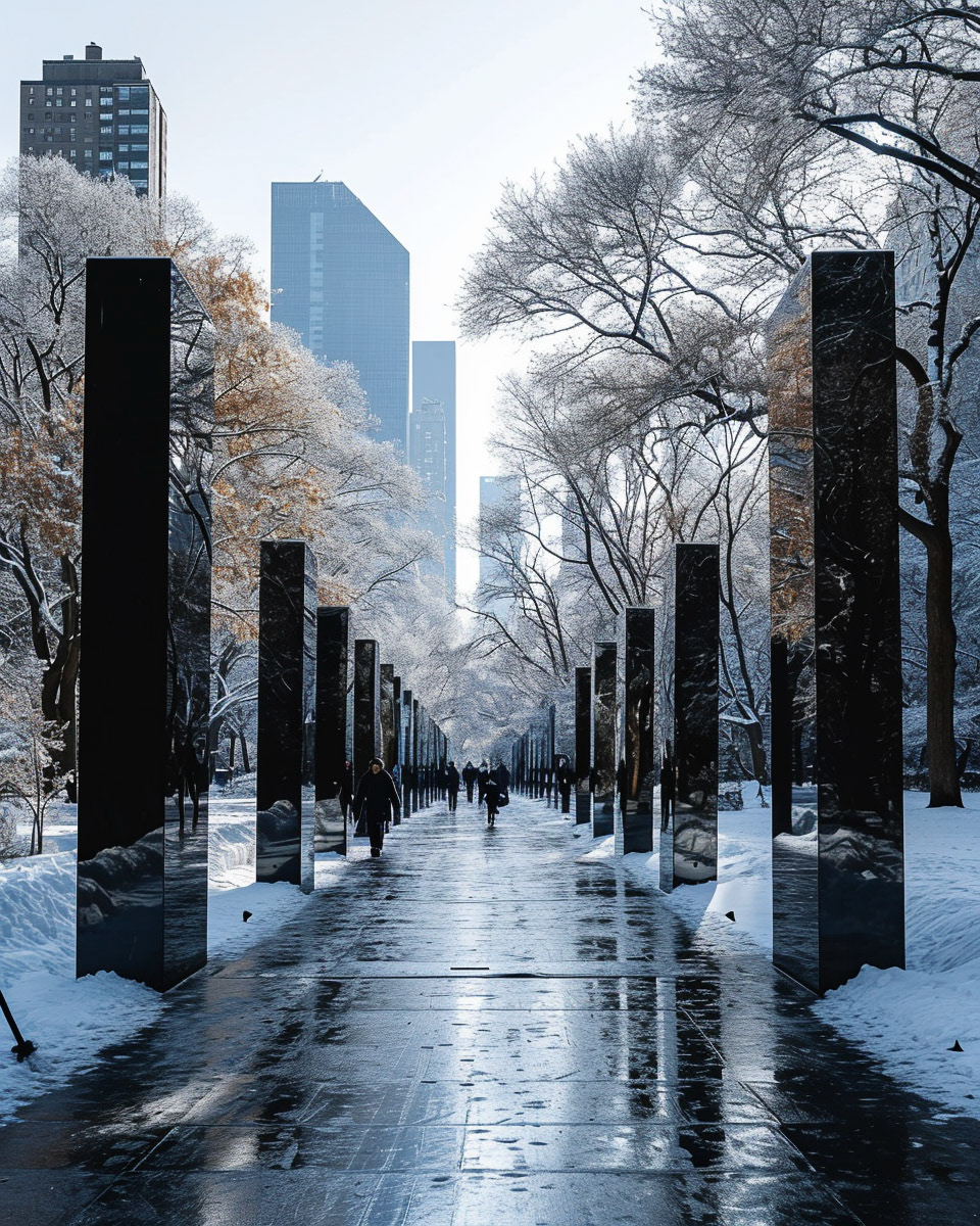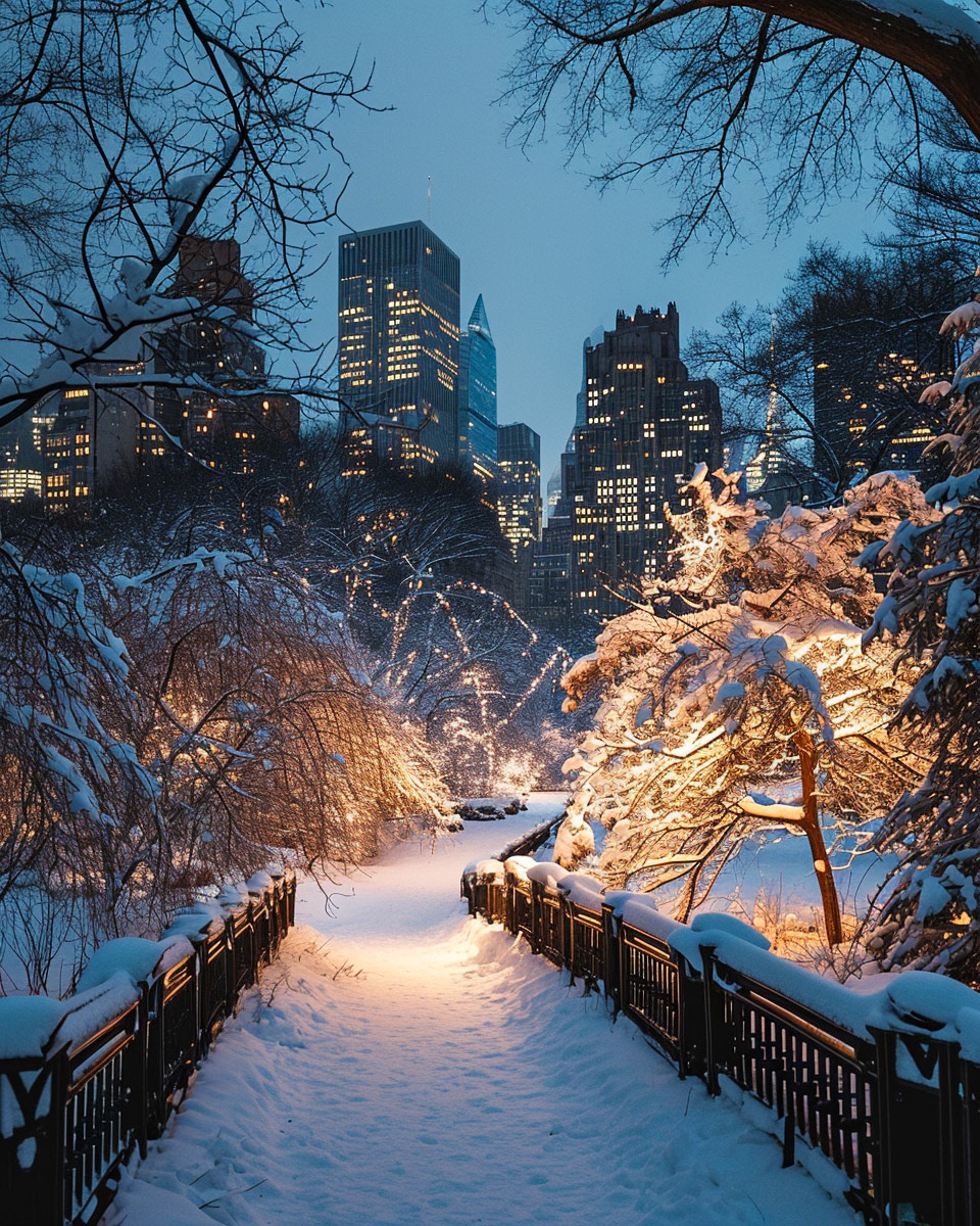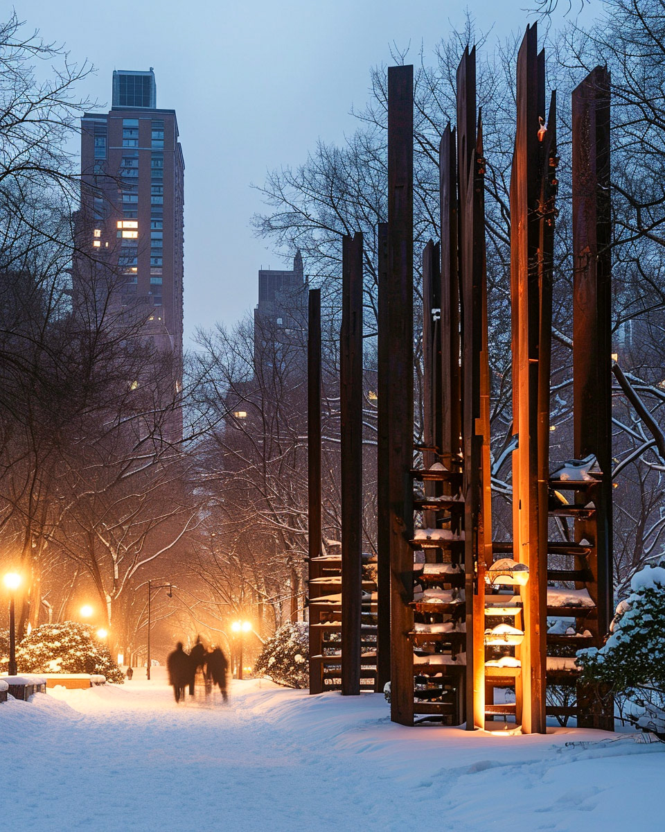Wintery magic in Central Park: Architectural sculptures grace the landscape, a festive harmony of design and nature. A seasonal spectacle that transforms New York's heart into an enchanting canvas of architectural wonder during Christmas time.