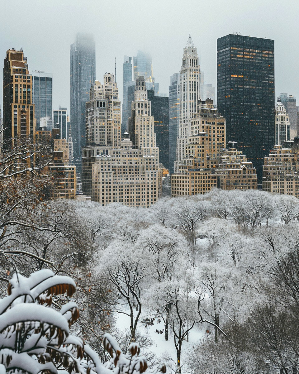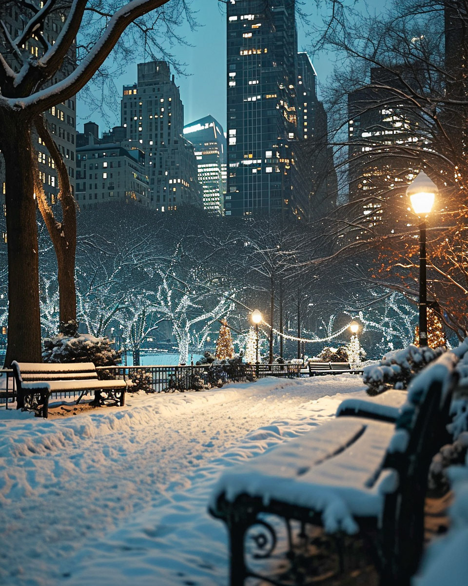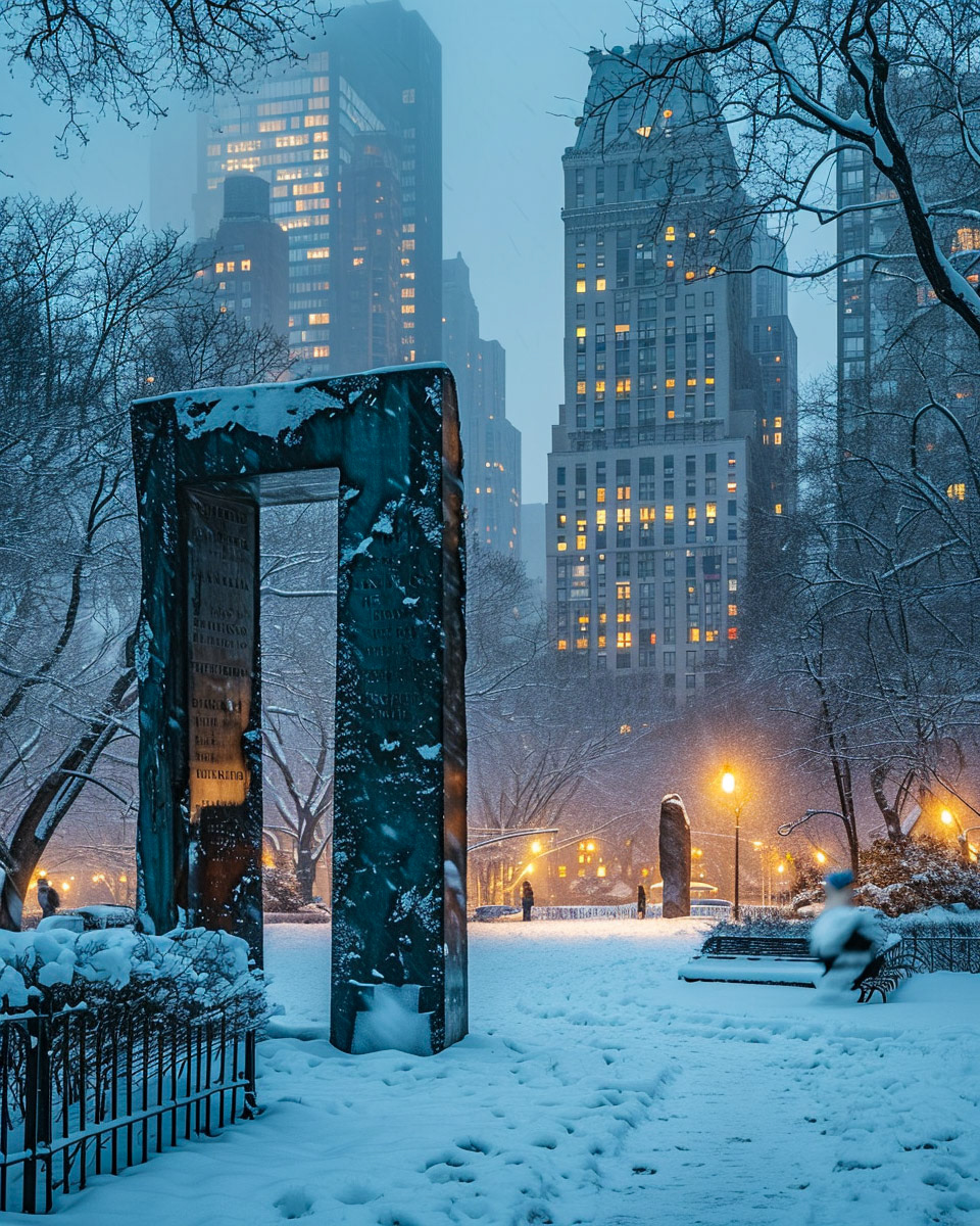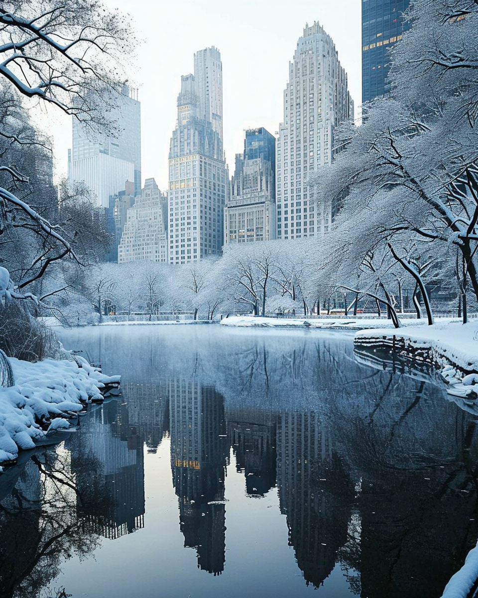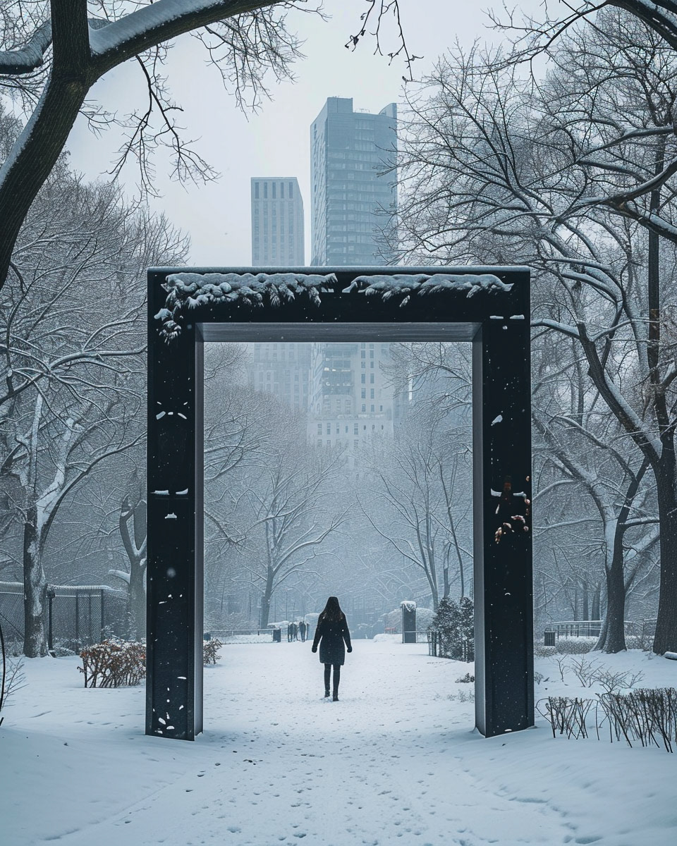 Wintery magic in Central Park: Architectural sculptures grace the landscape, a festive harmony of design and nature. A seasonal spectacle that transforms New York's heart into an enchanting canvas of architectural wonder during Christmas time.