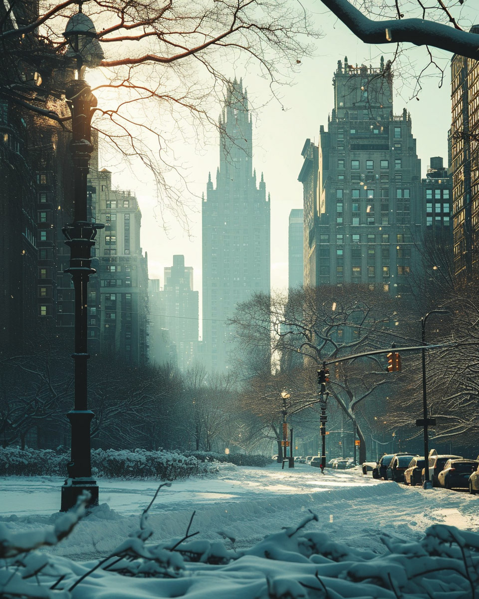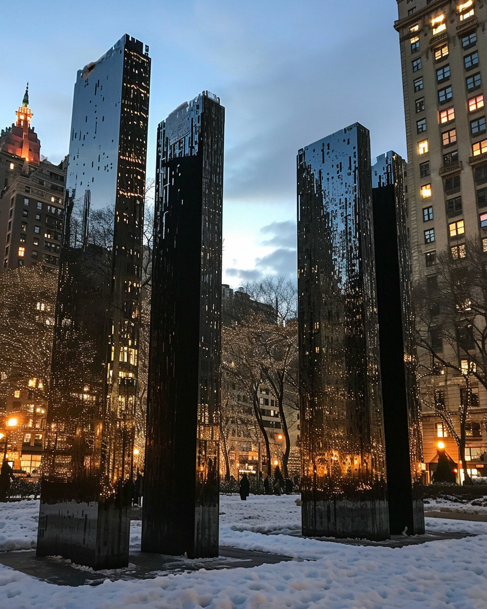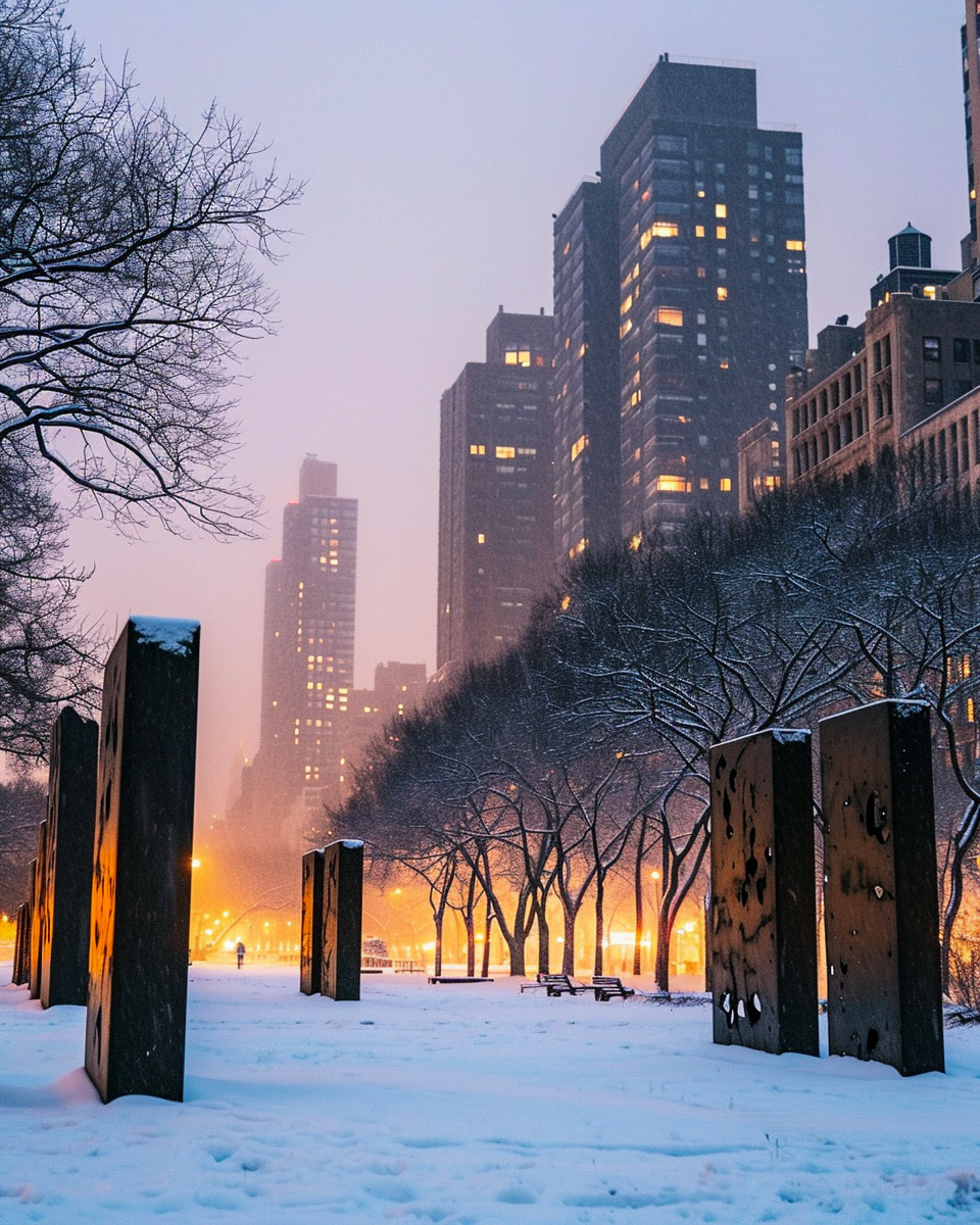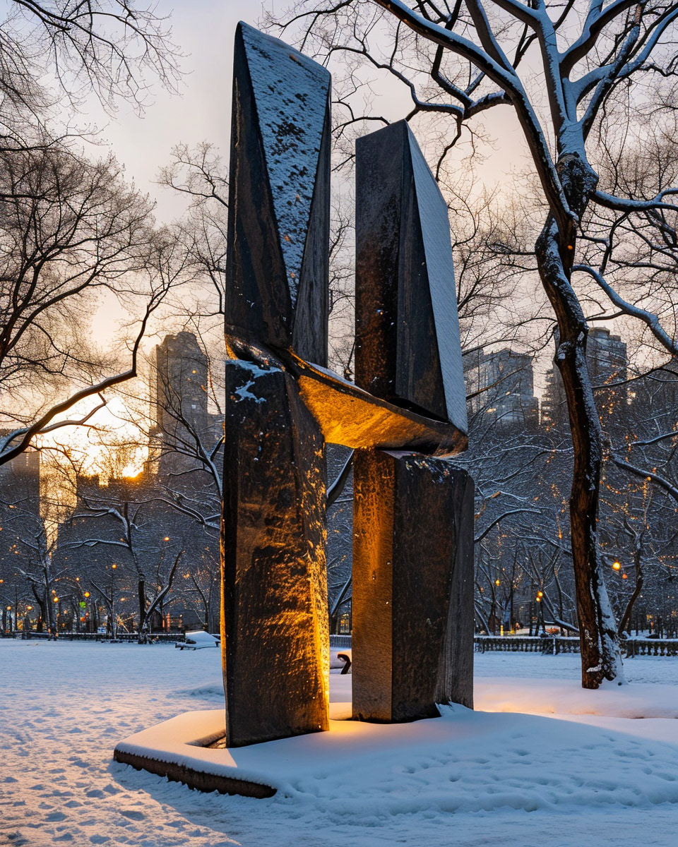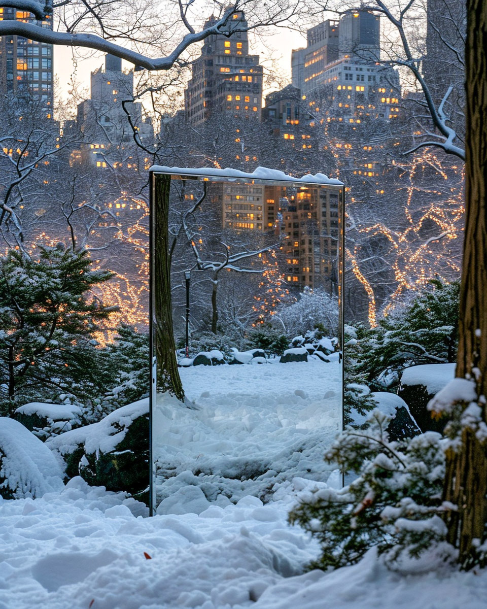 Wintery magic in Central Park: Architectural sculptures grace the landscape, a festive harmony of design and nature. A seasonal spectacle that transforms New York's heart into an enchanting canvas of architectural wonder during Christmas time.